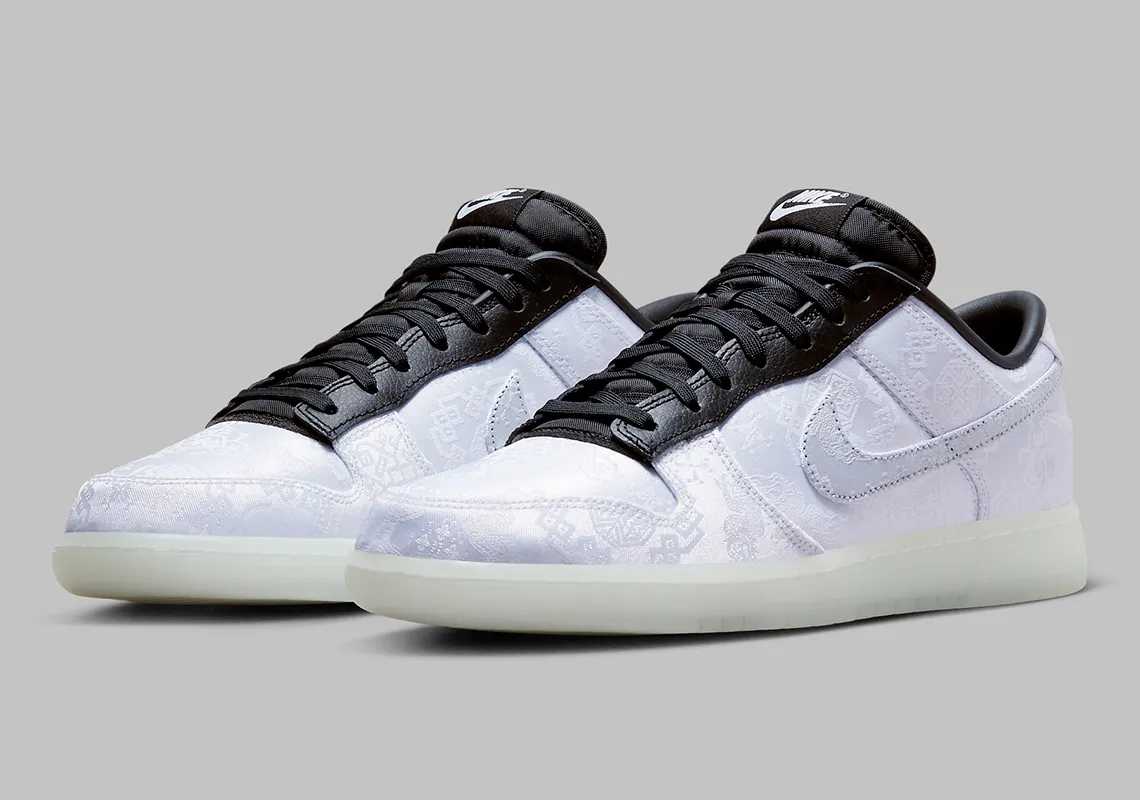 Inspired by Hiroshi Fujiwara's favourite CLOT shoe of the last two decades—the Air Force 1 x CLOT, also known as the 'White Silk' from 2018—the Dunk Low x CLOT x Fragment Design features an all-white silk-inspired upper patterned with CLOT's iconic Silk Royale, set on a cream-white opaque sole for a clean look. The tongue, lace stay and heel tab are rendered in black, resulting in the striking black and white colourway inspired by pandas, which Fujiwara fondly recalled visiting with Chen at the Chengdu reservation. The insole, meanwhile, features the CLOT20 logo, marking this a special release. Each pair of Dunk Low x CLOT x Fragment Design comes with black and blue laces for styling purposes.