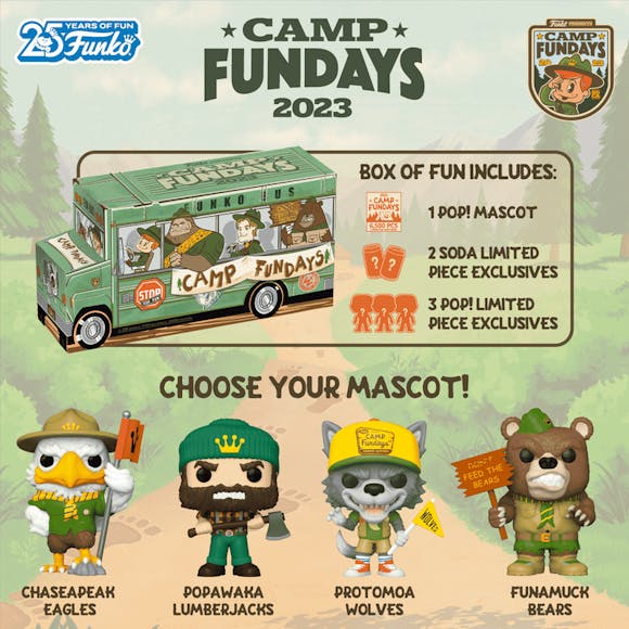Don’t forget to plan ahead and pack the team essentials for Camp Fundays 2023 with this exclusive Fundays Box of Fun! Choose your Camp Fundays team wisely. Each box is themed to one of the teams competing in the Fundays Camp Games! There’s Funamuck Bears, Chaseapeak Eagles, Protomoa Wolves, and Popawaka Lumberjacks.